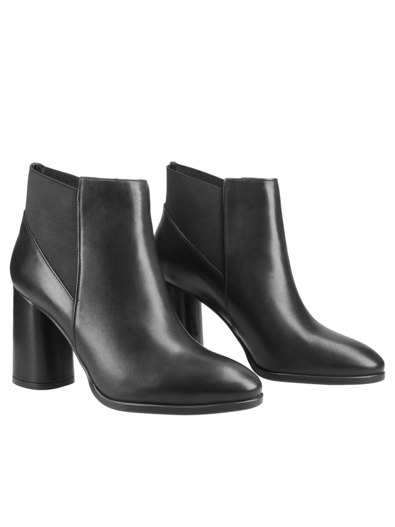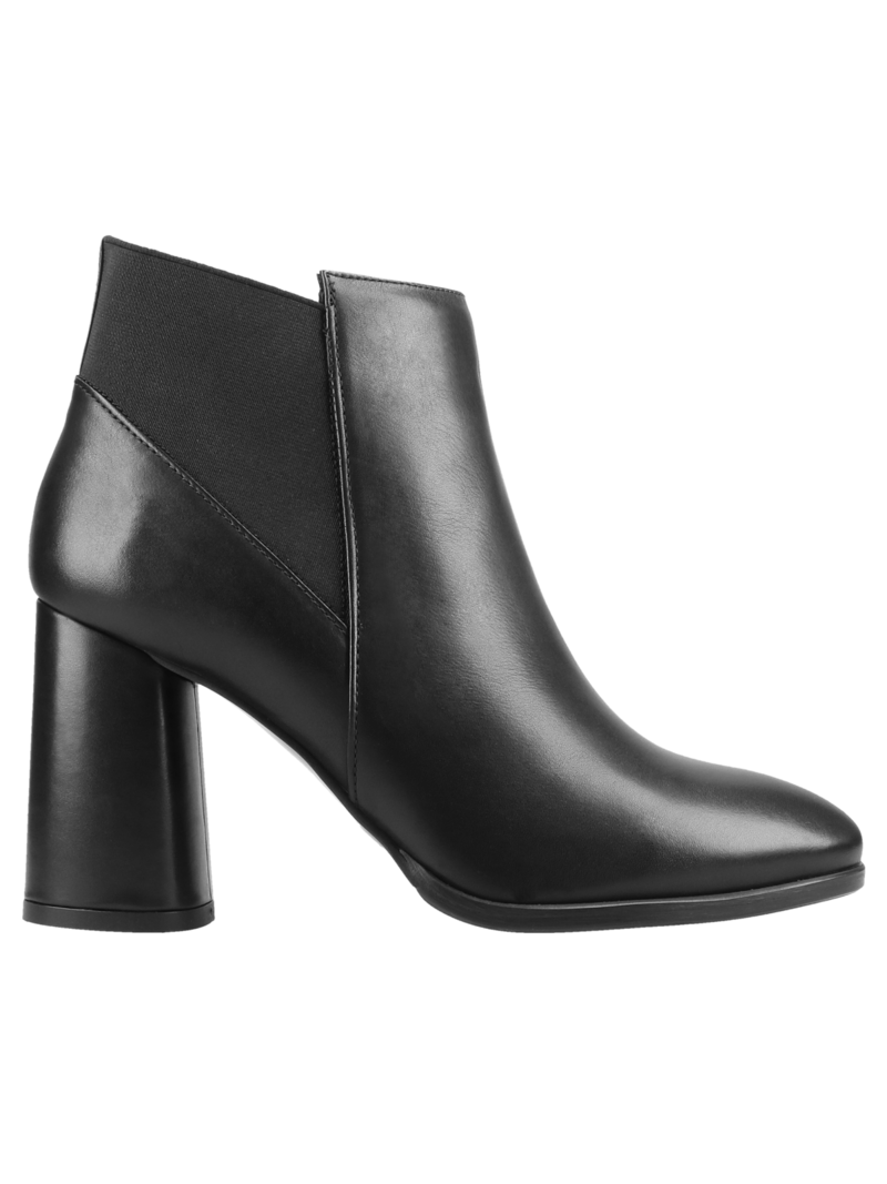 Klasyczna czerń i nietuzinkowy fason – tym wyróżniają się eleganckie botki Conhpol Woman. Z zewnątrz obuwie pokryte jest wysokiej jakości skórą licową, znakomicie prezentuje się z niemal każdym strojem utrzymanym w stylu smart casual. Na tylnej stronie cholewki posiadają elastyczną wstawkę, która ułatwia wsuwanie butów oraz stanowi oryginalny element dekoracyjny. Model postawiono na wysokim, 9-centymetrowym obcasie-słupku o zaokrąglonym kształcie. Doskonałe buty na wszelkie wyjścia w sezonie jesienno-zimowym. Numeracja typowa– proszę kierować się swoim rozmiarem. Model buta dedykowany dla wąskiej stopy.