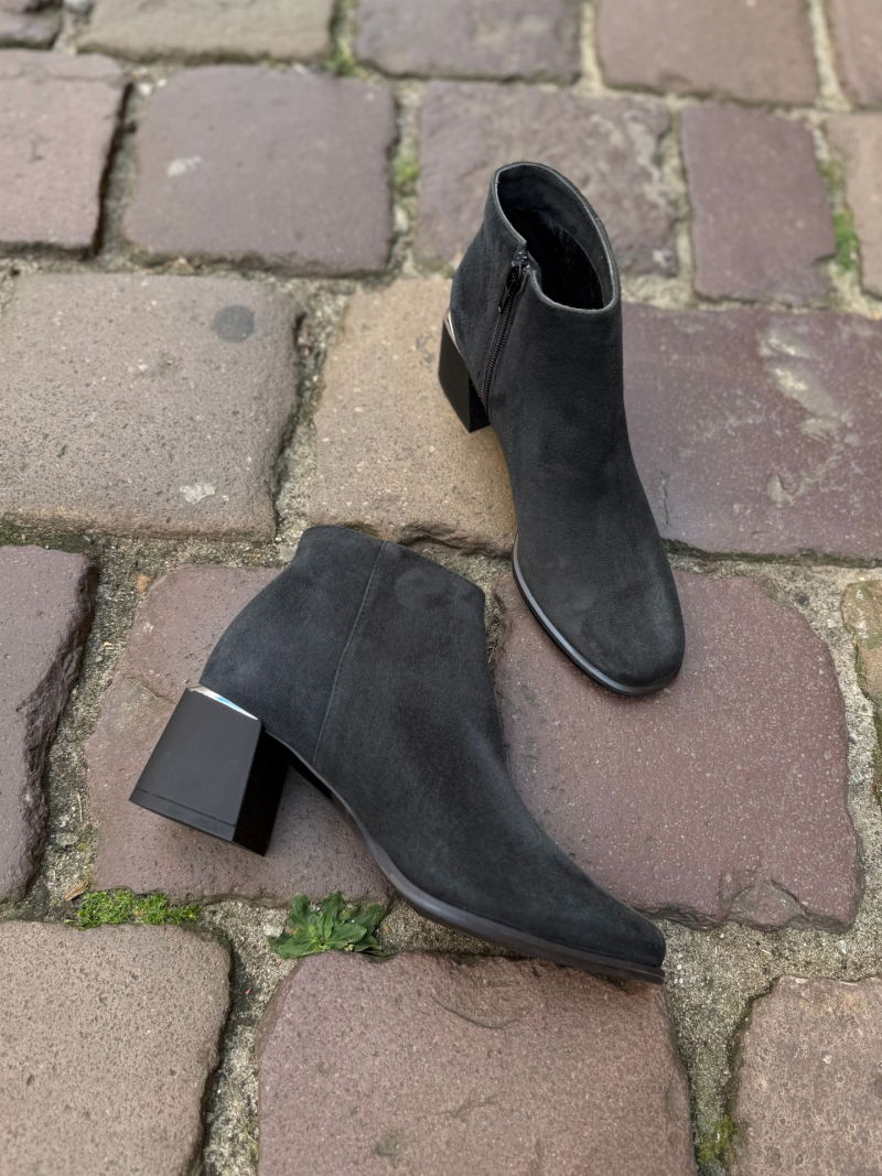 These women's heeled ankle boots in a dark graphite shade are a model that aligns with current trends yet remains timeless. Their minimalist, elegant lines make them a perfect match for dresses, pencil skirts, jeans, or fabric trousers. The smooth upper accentuates the slender leg, while the natural suede looks beautiful in daylight, adding depth and sophistication to any outfit. These shoes can be worn with both classic and modern styles, depending on the accessories you choose. By choosing suede ankle boots, you're investing in durability and quality. This material is distinguished by its softness, elegant appearance, and high durability, allowing the shoes to retain their shape for many seasons. The stable heel ensures safety and comfort, and the lightweight construction makes them perfect for everyday wear. It's the perfect choice for women who value a combination of comfort, fashionable design and practicality in one.