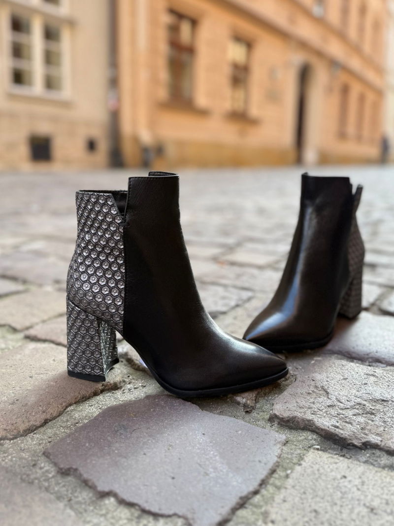 The unique character of Conhpol ankle boots comes from the combination of two types of leather and a subtle dark silver embellishment on the back of the upper. This detail distinguishes this classic model, adding elegance and a modern touch. The stable, high block heel ensures confidence and comfort, while the slim, pointed toe accentuates the feminine silhouette. These ankle boots combine style, quality, and comfort, making them the perfect choice for women who value fashion and practicality. Natural leather, meticulous finishing, and thoughtful construction ensure that the model not only looks great but also ensures comfort for many hours of wear. These shoes will add class and a unique character to any outfit.