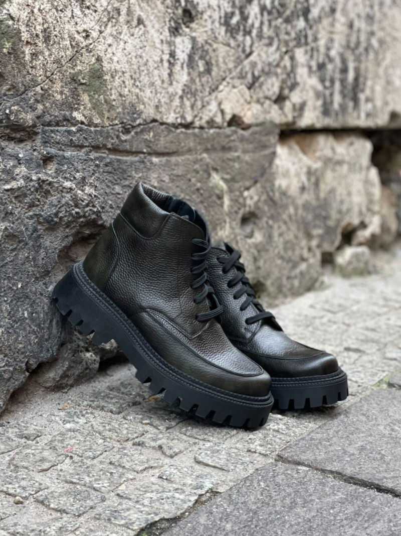 Despite the lace-up closure, this model features a zipper on the inside of the upper, allowing for quick on and off without the need to unlace. The thick, flexible sole guarantees lightness and comfort during long walks, while the distinctive stitching on the front of the upper visually slims the leg, maintaining a sleek look even with a more substantial sole. The interior is filled with warm black insulation, ensuring thermal comfort on colder days.