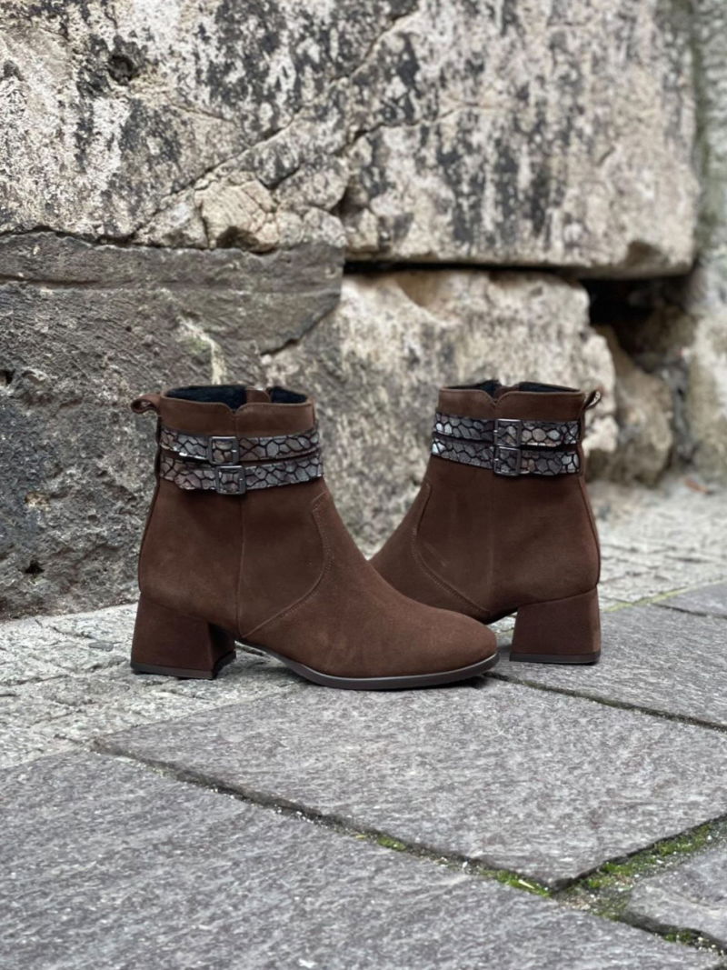 This model was designed for women who appreciate a combination of simplicity and classic style with a fashionable touch. Two thin straps with elegant buckles on the upper emphasize the stylish character of the shoes while remaining subtle and unobtrusive. A zipper on the inside makes them quick and easy to put on and take off. The rounded front gives the shoes a light feel, while their slim line beautifully elongates the foot. These brown boots are the perfect autumn boots, easily paired with trousers, dresses, or skirts.