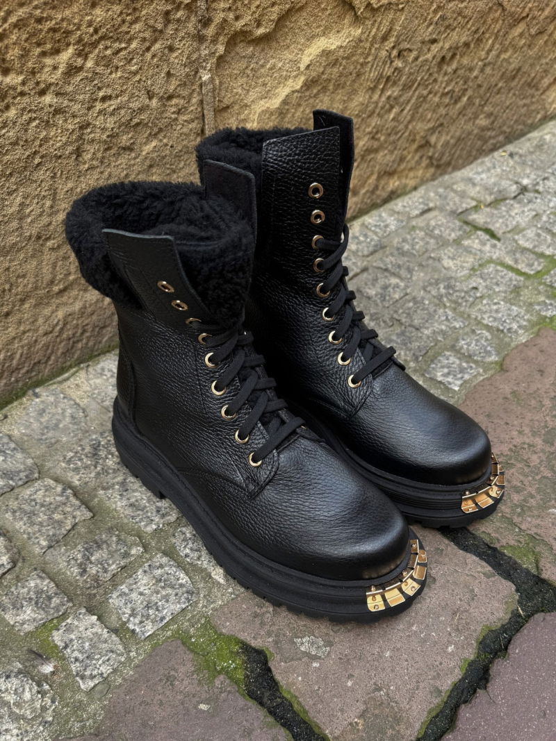 Women's leather hiking boots, black winter boots with sheepskin lining