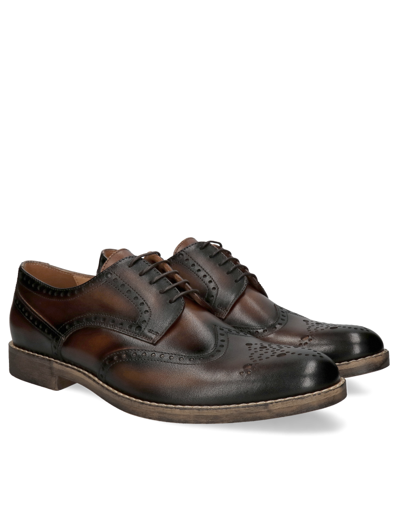 Allow me to introduce to you these men's shoes crafted from the finest natural leather. The harmonious fusion of brown and black tones, accentuated by artfully placed distressing, creates an intriguing visual allure that is bound to captivate.