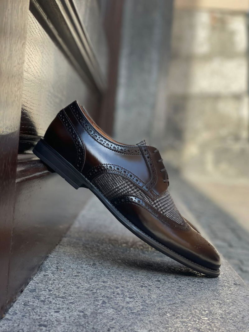 This is footwear that will meet the expectations of even the most demanding men, who appreciate high quality and timeless style. Hugo brown derby with check insert is a great choice for a suit. A blazer and formal pants, is an elegant alternative to a suit. Brown elegant shoes will add character and originality to the styling. Brown derby shoes with a check inset will be best matched with a leather belt and brown cotton socks.