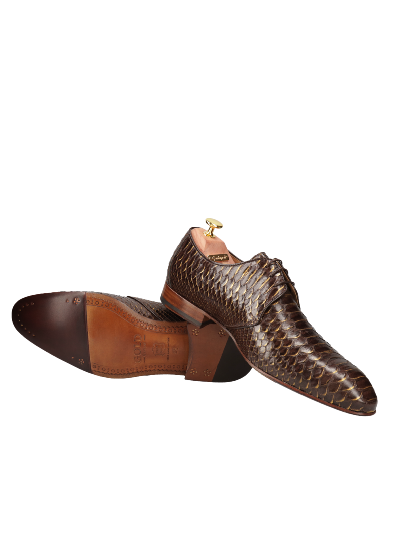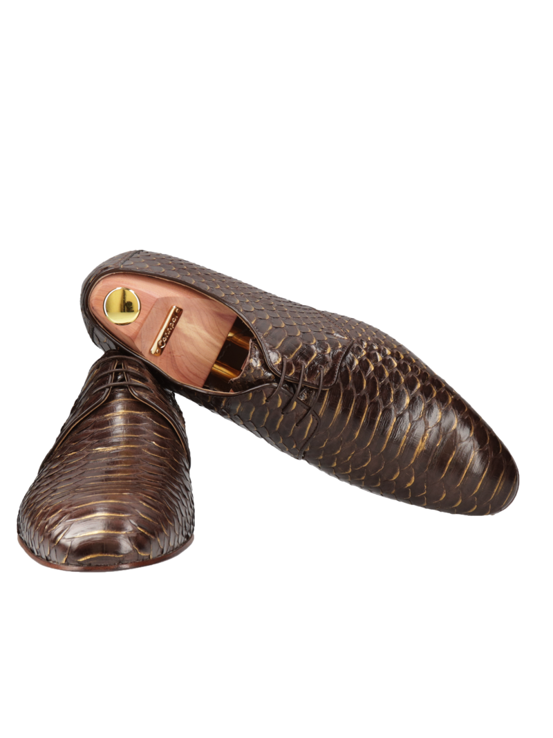 Derby marki Conhpol Gold w czarno-złotym wydaniu to nadzwyczajny dodatek i ozdoba stroju wykwintnego mężczyzny. Wierzch uszyty ze skóry pytona posiada egzotyczny wzór i wyjątkowo ciekawą fakturę. Wnętrze wykonane ze skóry bydlęcej znakomicie dopasowuje się do kształtu stóp i pozostaje wygodne przez długie lata, zapewniając nie tylko komfort i wygodę, ale także niezapomniane odczucia estetyczne. Całość obuwia dopełnia wysokiej jakości skórzana podeszwa. Kupując modele z kolekcji GOLD otrzymujesz od nas parę cedrowych prawideł i dodatkowy komplet sznurowadeł. Dodatkowo w przypadku tego modelu dołączamy certyfikat CITES potwierdzający pochodzenie egzotycznej skóry, z której wykonana jest ta para butów.