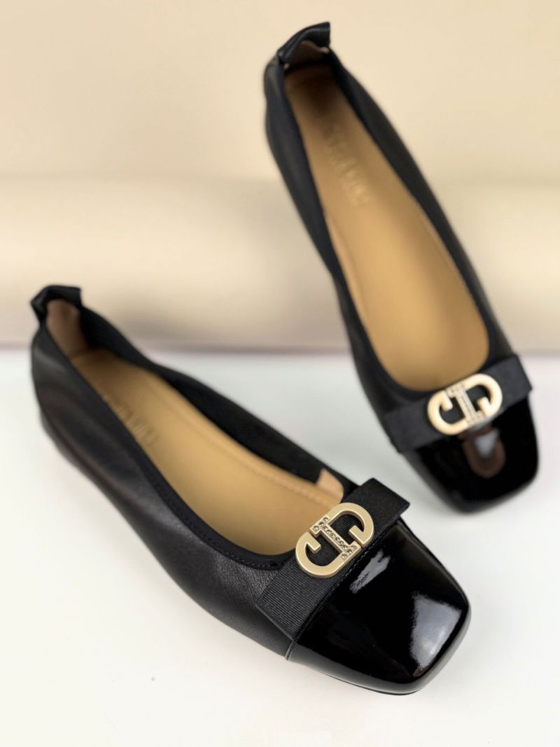Women's leather ballerina flats, comfortable with a burgundy patent leather strap
