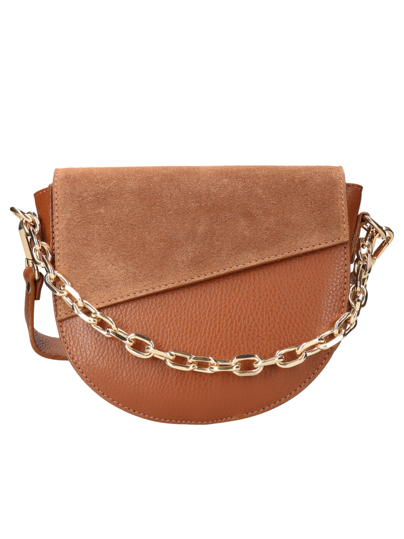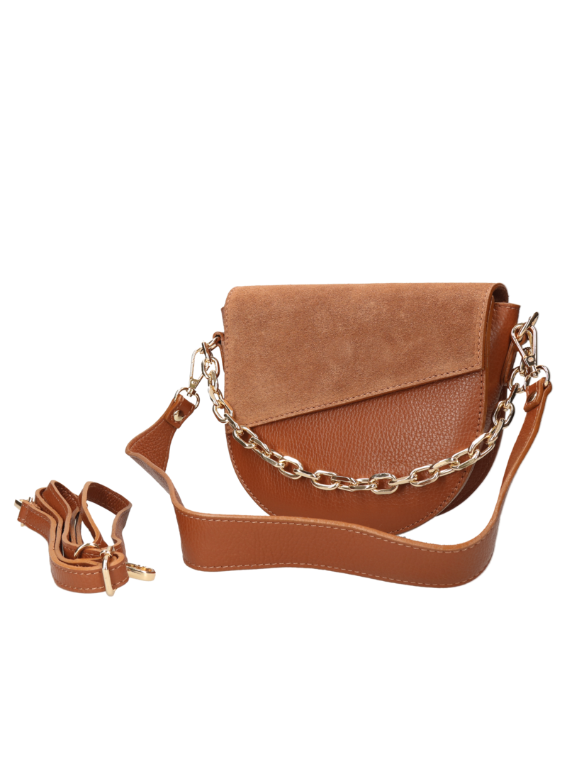 Brązowa torebka to idealna propozycja torebki dla kobiet ceniących dobry styl połączony z klasyczną formą oraz odważnymi dodatkami. Torebka ze złotym ozdobnym łańcuchem została wykonana ze skóry naturalnej licowej oraz zamszowej. Wnętrze posiada jedną komorę i jest wykończone podszewką. Posiada długi regulowany pasek (maksymalna długość 130cm, maksymalna wysokość 65cm) oraz krótszy bez regulacji (długość 55cm, wysokość 25cm, szerokość 3.8cm). Wewnątrz znajduje się mała, zasuwana kieszonka mieszcząca telefon czy klucze.