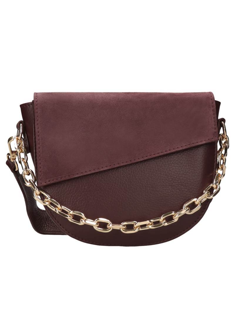Maroon women's Lina bag is a new version of the classic shoulder bag. The small, non-A4 size bag will be an interesting addition to spring stylings. The semi-circular shape has been accented with slightly protruding sides. Made of high-quality natural pea leather in a deep plum shade. An asymmetrical flap made of suede leather in the same shade gives an interesting shape to the whole. A thick gold chain combined with other gold elements (clasps and zipper) adds glamour. The bag has a zipper and an additional snap on the flap. Spacious. It will easily accommodate the most important feminine trinkets. Inside a small pocket. An interesting addition is two straps. A short one, perfect for carrying the bag on the shoulder. And a longer, thinner one, which allows carrying the bag diagonally.