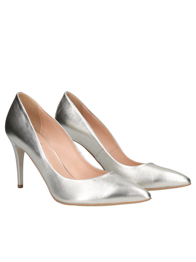 Metaliczny odcień srebra wspaniale komponuje się z większością kolorów. Srebrne szpilki zaś szczególnie korzystnie wyglądają z chłodnymi barwami, dlatego można je nosić np. z dopasowanymi spodniami khaki lub klasyczną małą czarną. Wykonane z miękkiej koziej skóry buty, szybko dopasowują się do stóp i zapewniają uczucie komfortu podczas chodzenia. Wysokie, 8,5-centymetrowe obcasy i spiczaste noski nadają im wyrafinowanego charakteru, dodatkowo wysmuklając nogi. Idealne obuwie na eleganckie, nieformalne spotkania. Numeracja typowa– proszę kierować się swoim rozmiarem. Model buta dedykowany na standardową szerokość stopy.