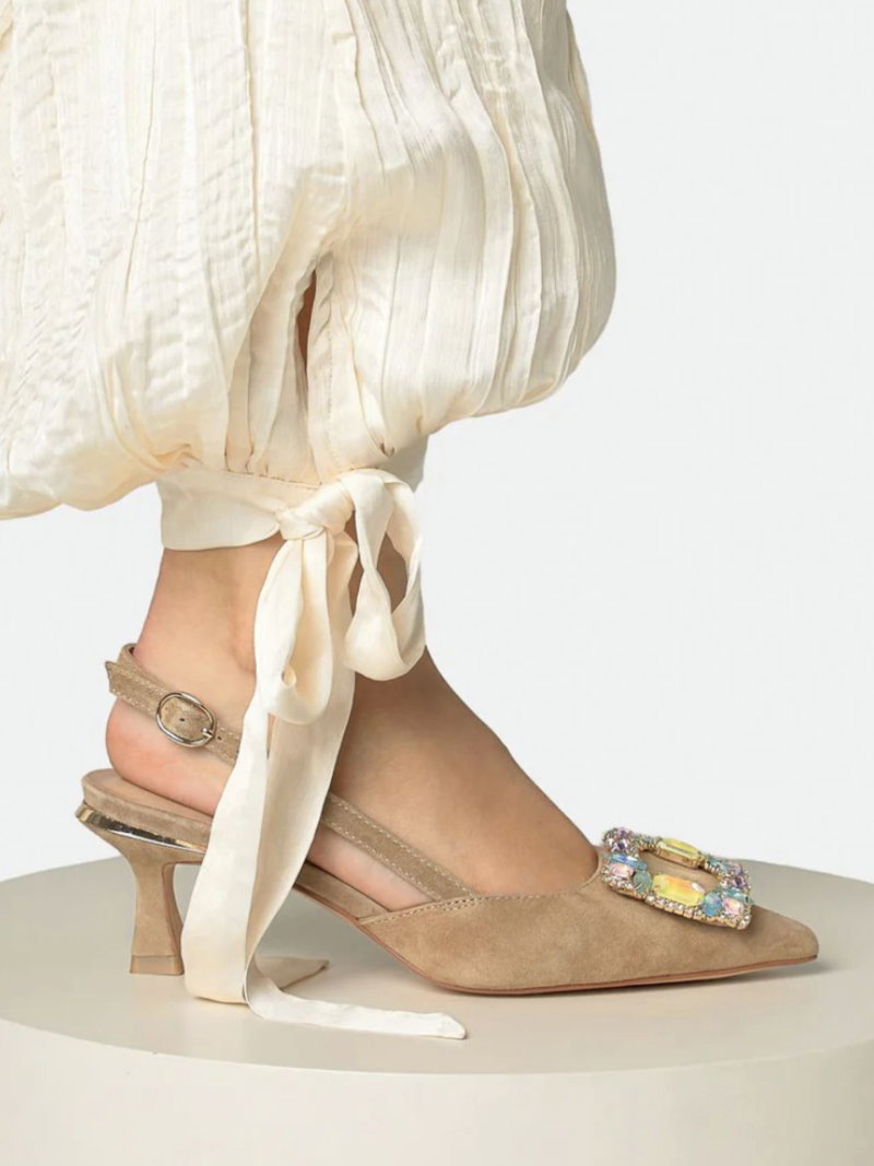 Women's woven slingback pumps without heels, openwork shoes made of interwoven leather in black and beige