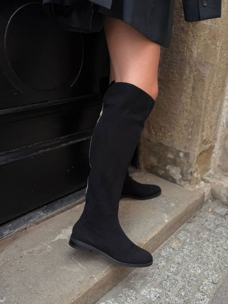 These women's black suede boots are a perfect choice for women who value classic style and comfort with a modern twist. Made of natural, soft suede leather, they look very elegant and subtle. The simple lines of the 46 cm high upper beautifully accentuate the leg, while the almond toe adds a light and feminine touch. These shoes have a timeless design that will successfully complement both casual and elegant outfits.