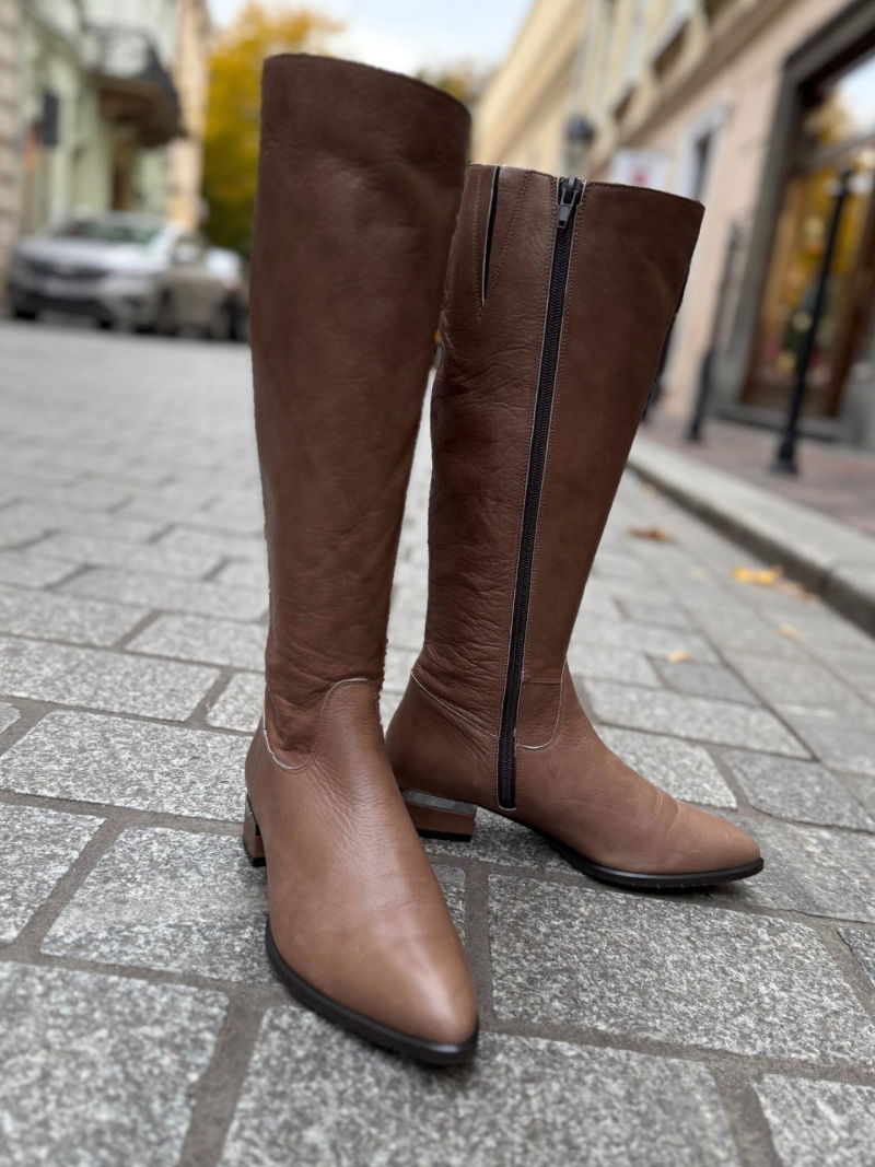 These tall brown boots are a classic at its finest. Crafted from soft, genuine leather, they captivate with their subtly soft, natural leather and exceptionally soft feel. Their slim design, finished with a pointed toe, visually elongates the leg and adds a touch of lightness to the silhouette. The warm shade of brown perfectly complements fall and winter trends, providing an ideal alternative to classic black. This model combines elegance with comfort – created for women who value quality, style, and timelessness.