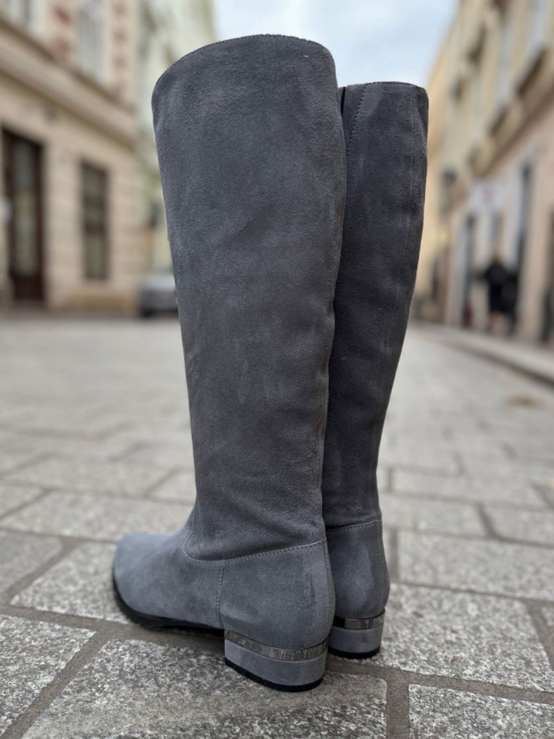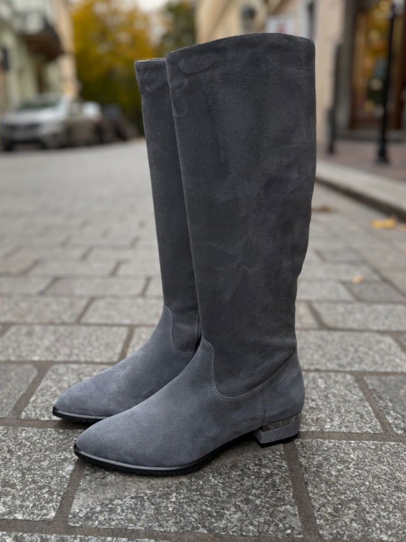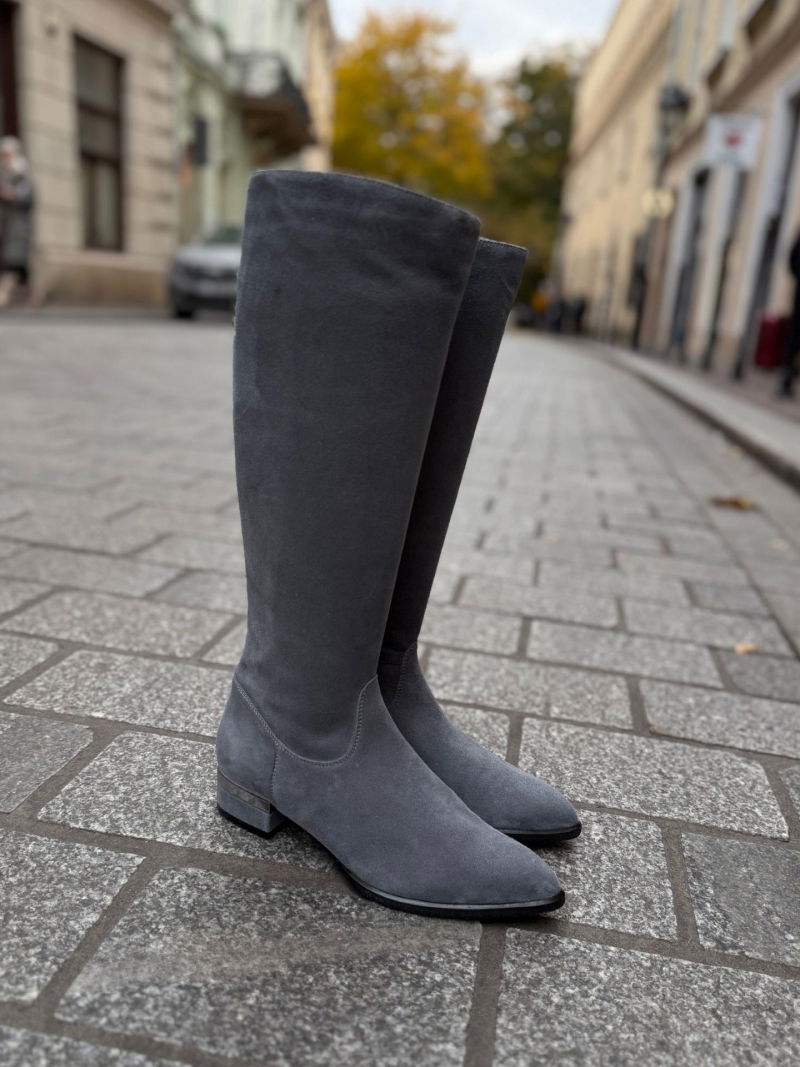 Women's gray suede boots, comfortable pointed-toe boots with low heels