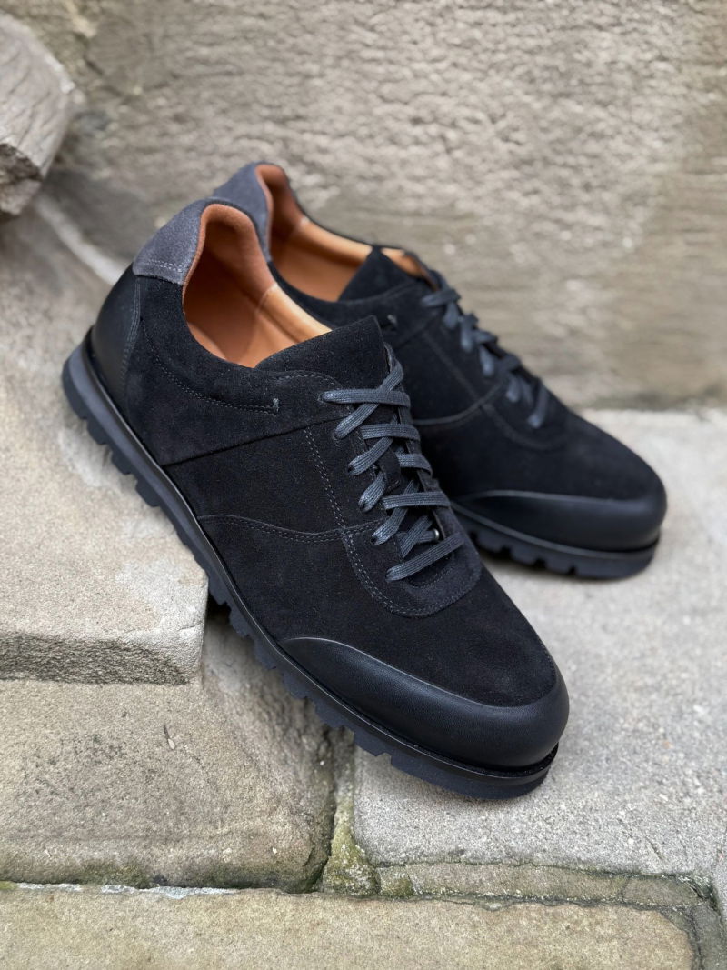 The upper is made of high-quality black suede, which is soft, pleasant to the touch, and aesthetically pleasing. Black full-grain leather inserts are featured on the front and heel, reinforcing the structure and increasing the shoe's durability. An additional decorative element is an ash-gray suede leather insert on the heel, which subtly breaks up the overall design and gives the shoes a modern character. The interior of the shoes is finished with super-soft natural cowhide. This leather adapts perfectly to the shape of the foot, providing high comfort and adequate ventilation, ensuring the shoes remain comfortable even after long hours of use.
