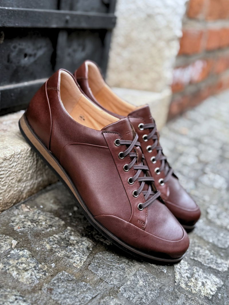 The whole thing is set on a light brown and black sole, which perfectly complements the dark chocolate-colored full-grain leather and adds a modern touch. The sole is practical and stable, making these shoes suitable for everyday use – both in the city and at work. The lace-up construction allows for a snug fit and provides a secure fit, further enhancing comfort. These men's shoes are designed for those who value style but also want true functionality and lightweight comfort. If you're looking for smart-casual footwear that looks elegant yet provides everyday comfort, this model is perfect.