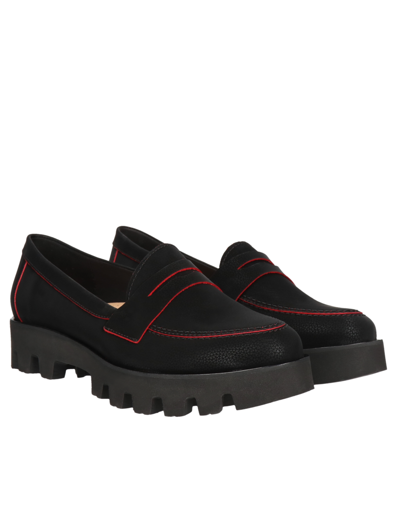 This season's most fashionable shoes Liliana! Made of black nubuck leather finished with red trim which gives a unique character. The whole is set on a thicker trapper sole made of super-light material, which makes the shoe, despite its strong look, extremely lightweight. To ensure 100% comfort inside there are specially shaped insole, thanks to which even a long day on your feet will not be a problem. The shoes perfectly fit into the casual style. A MUST HAVE in every woman's collection.