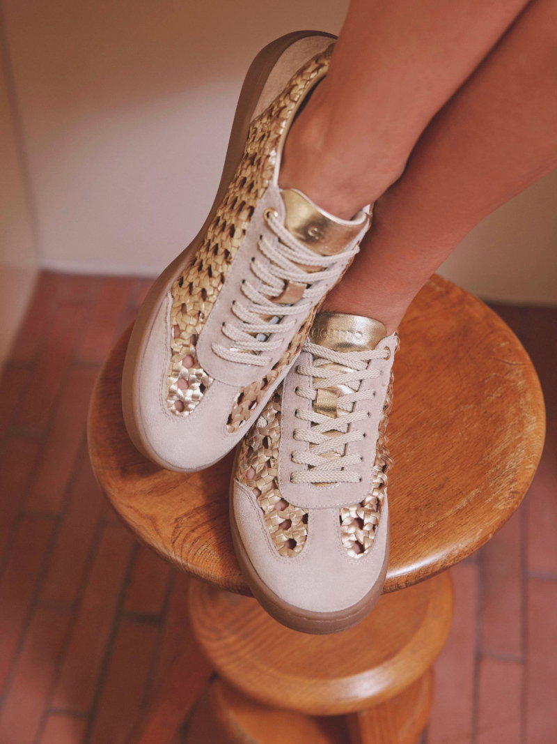 These women's openwork sneakers in a light gold shade combine a sporty design with a luxurious finish. The entire upper – including the lining – is made of high-quality genuine leather, making the shoes exceptionally soft and comfortable. The generous woven gold full-grain leather subtly reveals the leg, providing breathability and a lightweight feel while maintaining the character of a full-grain sneaker. The combination of light beige suede and braided metallic leather creates a harmonious color scheme that emphasizes modern style and premium quality.