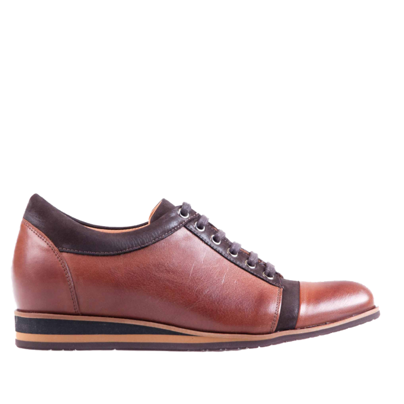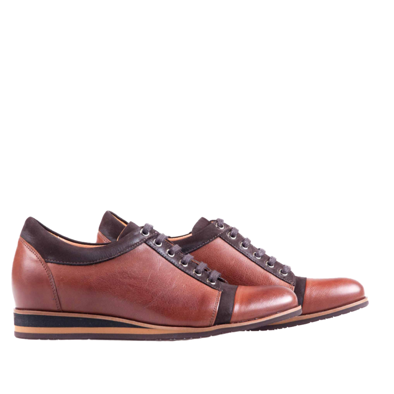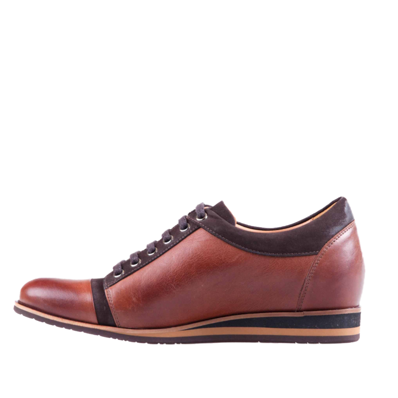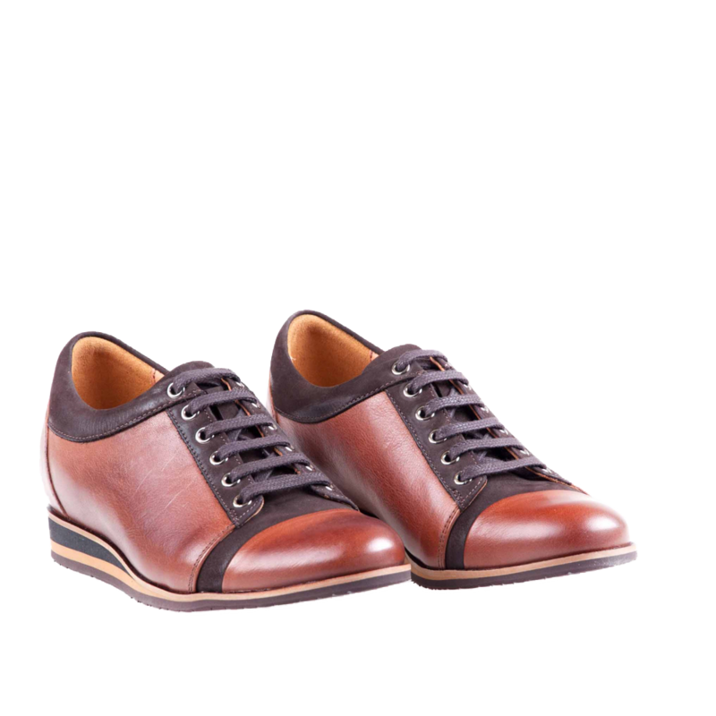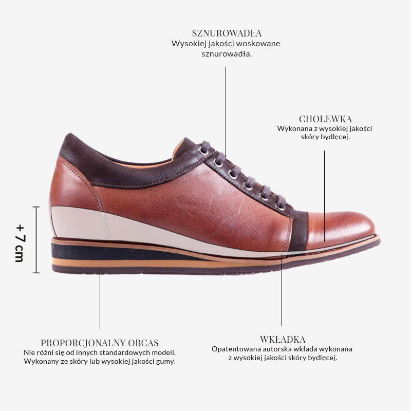 Półbuty z kolekcji podwyższającej dla mężczyzn ceniących aktywny wypoczynek czy to w mieście, czy w poza nim. Kontrastowa podeszwa nadaje linii sportowy, modny look. Ukryta wkładka w dyskretny sposób dodaje kilka centymetrów. Materiały wykorzystane do wykonania obuwia (skóra bydlęca i podeszwa typu tuniskór) zapewniają komfortowe użytkowanie przez długi czas. Brąz to idealny towarzysz wielu casualowych stylizacji. Dzięki kolekcji „butów podwyższających” klient ma możliwość uzyskania dodatkowych 7 cm wzrostu, poprzez zastosowanie unikalnej konstrukcji obuwia, która z zewnątrz jest całkowicie niewidoczna. Zastosowana wewnątrz wkładka z wyższym zapiętkiem zapewnia sprawdzone i stabilne trzymanie pięty. Technologia ta zapewnia oraz gwarantuje satysfakcję i wygodę użytkowania. Obuwie pozyskuje duże grono zwolenników, nie tylko o niskim wzroście. Autorska wkładka zastosowana w butach podwyższających zyskała już miano „wzoru patentowego”, co oznacza, że jest wyjątkowym produktem na rynku.