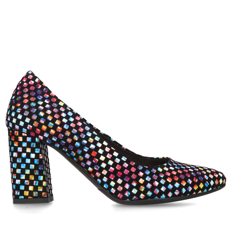 Wyjątkowe czółenka damskie skórzane zamszowe Lindasy w piękny, kolorowy, geometryczny wzór