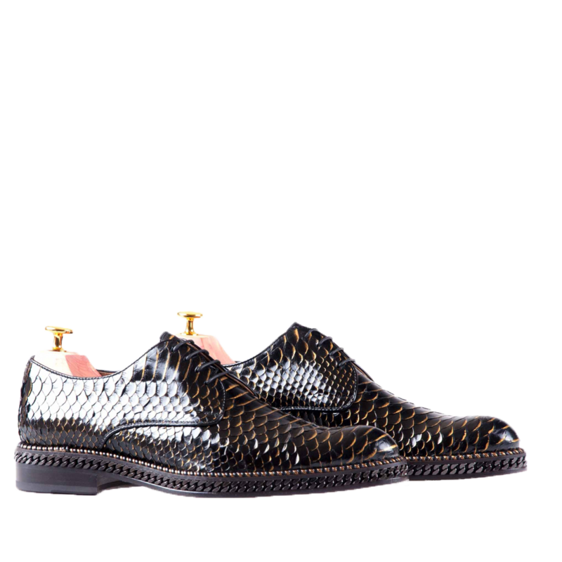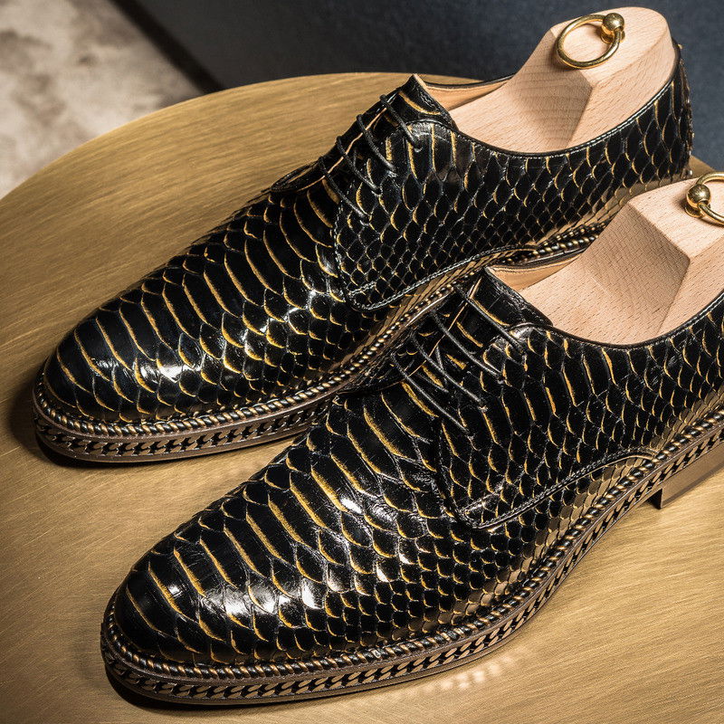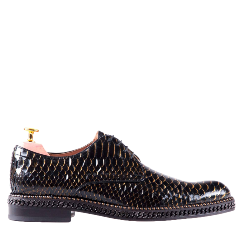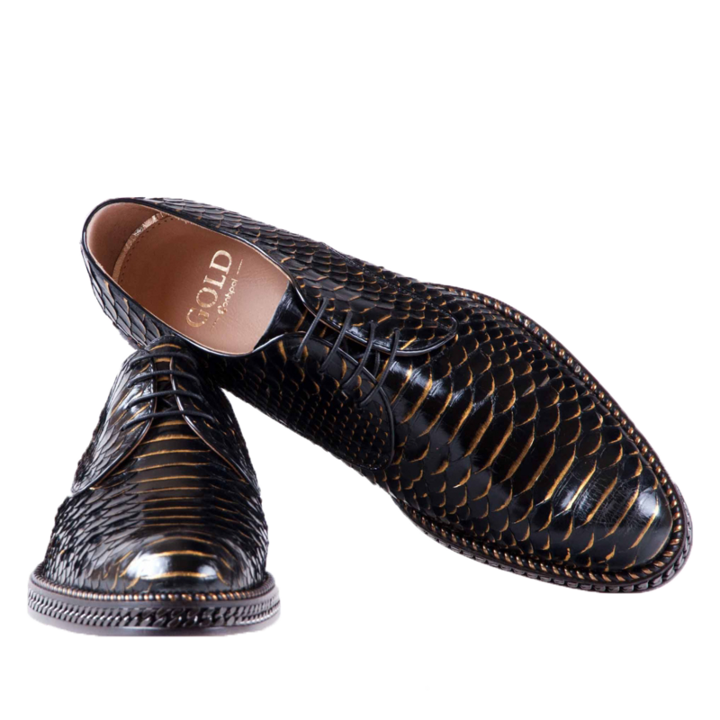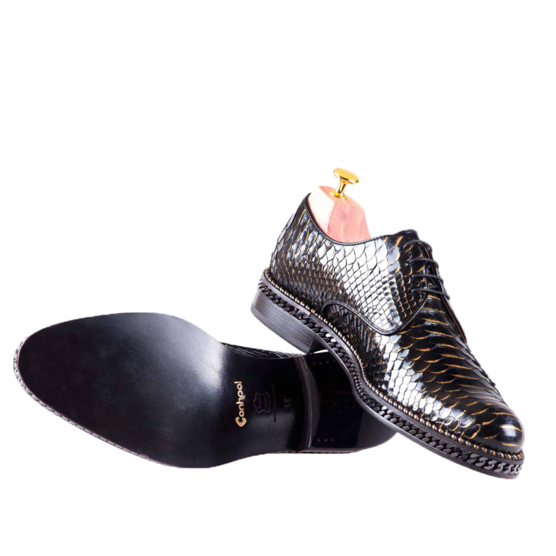 Derby marki Conhpol Gold w czarno-złotym wydaniu to nadzwyczajny dodatek i ozdoba stroju wykwintnego mężczyzny. Wierzch uszyty ze skóry pytona posiada egzotyczny wzór i wyjątkowo ciekawą fakturę. Wnętrze wykonane ze skóry bydlęcej znakomicie dopasowuje się do kształtu stóp i pozostaje wygodne przez długie lata, zapewniając nie tylko komfort i wygodę, ale także niezapomniane odczucia estetyczne. Podeszwę z naturalnej skóry obszyto ciemnym łańcuchem, który stanowi spektakularne wykończenie tego modelu.Kupując modele z kolekcji GOLD otrzymujesz od nas parę cedrowych prawideł i dodatkowy komplet sznurowadeł. Dodatkowo w przypadku tego modelu dołączamy certyfikat CITES potwierdzający pochodzenie egzotycznej skóry, z której wykonana jest ta para butów.
