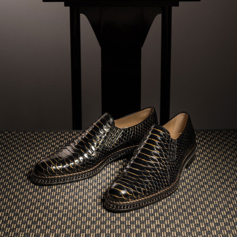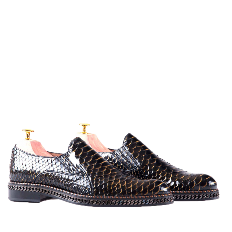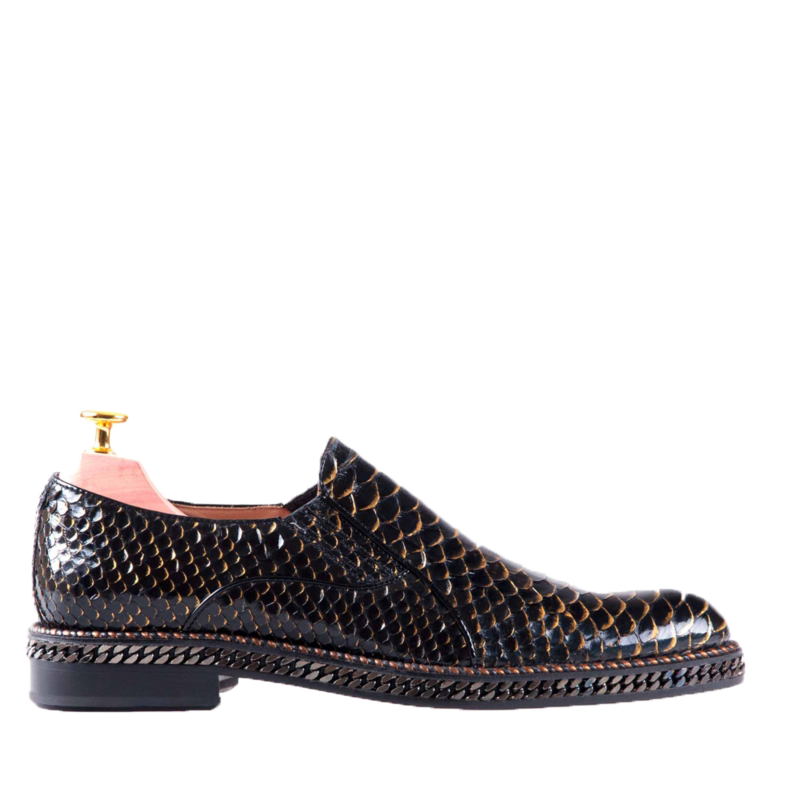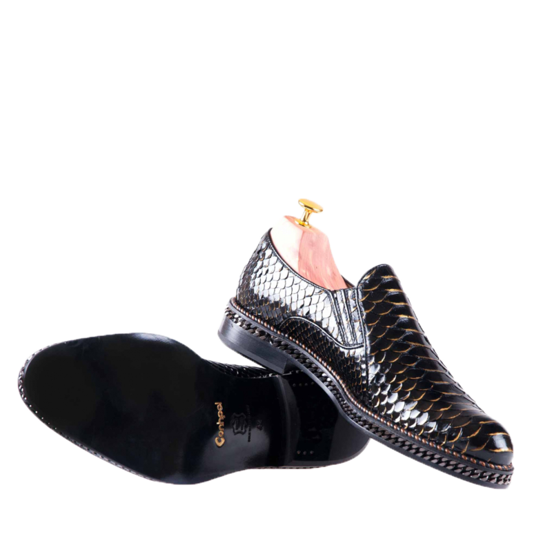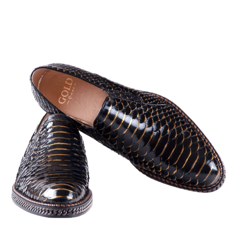 Ekskluzywne wsuwane półbuty marki Conhpol Gold to wyjątkowy dodatek do strojów na specjalne okazje. Czarno-złotą barwę zawdzięczają egzotycznej skórze pytona, która zachwyca swą niecodziennością. Wnętrze i wyściółkę uszyto ze skóry bydlęcej, przez długie lata odpornej na uszkodzenia i jednocześnie idealnie dopasowuje się do kształtu stóp. Model postawiony na ręcznie wykonanej, wysokiej jakości skórzanej podeszwie otoczonej ciemnym łańcuchem, który dodaje mu prestiżu i stanowi jego efektowne wykończenie.Kupując modele z kolekcji GOLD otrzymujesz od nas parę cedrowych prawideł i dodatkowy komplet sznurowadeł. Dodatkowo w przypadku tego modelu dołączamy certyfikat CITES potwierdzający pochodzenie egzotycznej skóry, z której wykonana jest ta para butów.