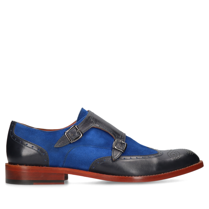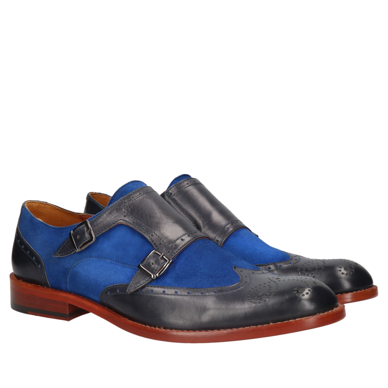 Ekskluzywne buty męskie potrafią uszlachetnić każdą męską stylizację. Dobierając dodatki, w tym przede wszystkim obuwie, warto kierować się nie tylko wygodą i ponadczasowymi standardami. Pozwalając sobie na odrobinę szaleństwa i ekstrawagancji warto sięgnąć po męskie buty inne niż wszystkie. Zachwycające kolorem, formą, jakością wykonania i doborem materiałów. Warto sięgnąć po buty takie jak te, niebiesko-granatowe eleganckie półbuty męskie Julian. Skórzane monki zapinane na dwie, ozdobne klamry same w sobie są ozdobą. Dokładając do tego ozdobne dziurkowania w stylu brogsów oraz czerwoną podeszwę uzyskamy finezyjną kompozycję klasyki i nonszalanckiej elegancji. O wyjątkowości tego modelu przemawia także wysoka jakość użytych materiałów. Połączenie naturalnej skóry licowej i zamszowej nadaje butom niezwykłej formy. A precyzja wykonania. Dbałość o każdy element przejawia się w nawet najmniejszych szczegółach.