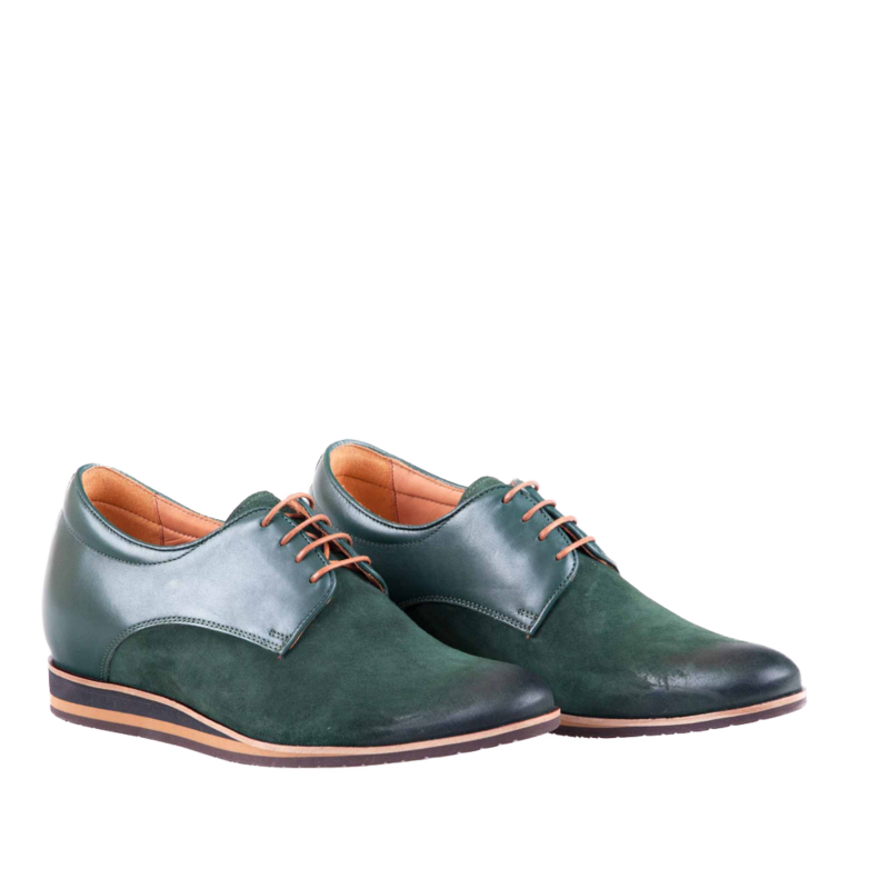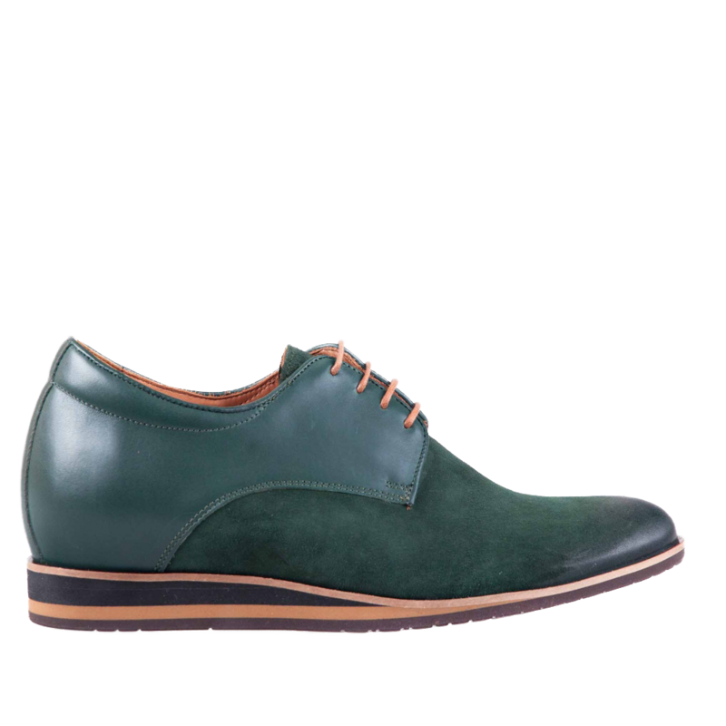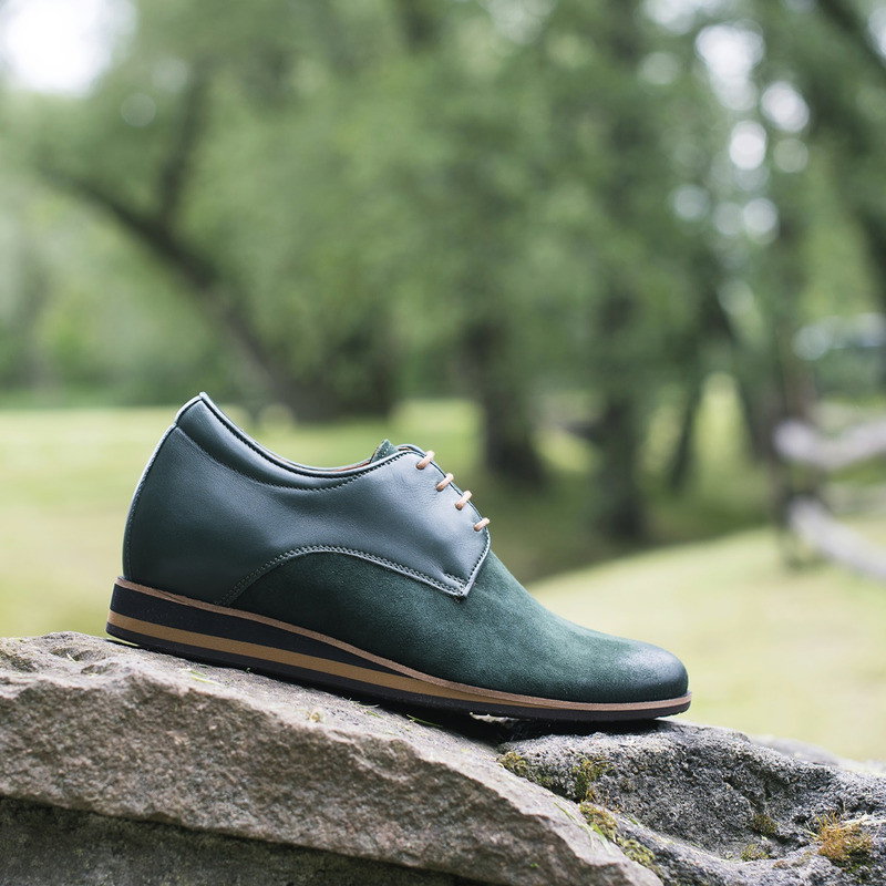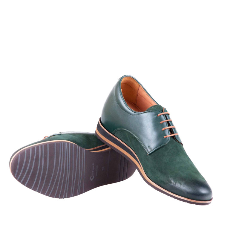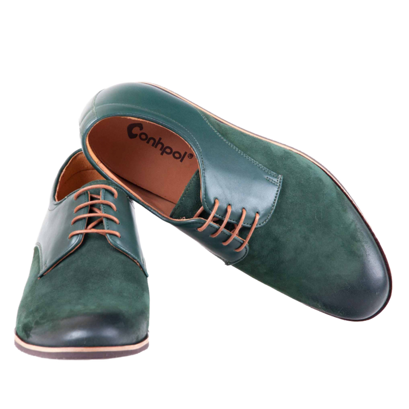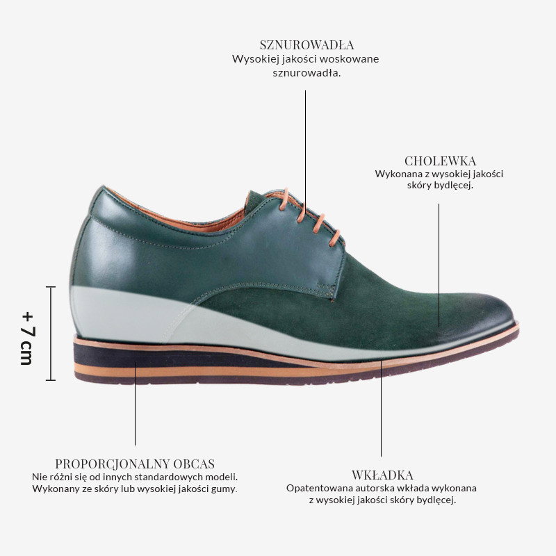 Męskie półbuty Conhpol w oryginalnym kolorze morskiej zieleni to doskonały wybór obuwia casualowego. Gruba, ale lekka i elastyczna podeszwa ekstra light dodaje im odrobinę sportowego charakteru, dlatego ten model świetnie wygląda np. z beżowymi chinosami i bawełnianą koszulką polo. Dzięki wierzchowi wykonanemu z miękkiej koziej skóry licowej i zamszowej stanowią niebanalny dodatek. Niewidoczna wkładka podwyższa o kilka centymetrów, zapewniając jednocześnie ogromny komfort i wygodę podczas noszenia. Dzięki kolekcji „butów podwyższających” klient ma możliwość uzyskania dodatkowych 7 cm wzrostu, poprzez zastosowanie unikalnej konstrukcji obuwia, która z zewnątrz jest całkowicie niewidoczna. Zastosowana wewnątrz wkładka z wyższym zapiętkiem zapewnia sprawdzone i stabilne trzymanie pięty. Technologia ta zapewnia oraz gwarantuje satysfakcję i wygodę użytkowania. Obuwie pozyskuje duże grono zwolenników, nie tylko o niskim wzroście. Autorska wkładka zastosowana w butach podwyższających zyskała już miano „wzoru patentowego”, co oznacza, że jest wyjątkowym produktem na rynku. Numeracja obuwia zawyżona - sugestia wyboru rozmiaru mniejszego.