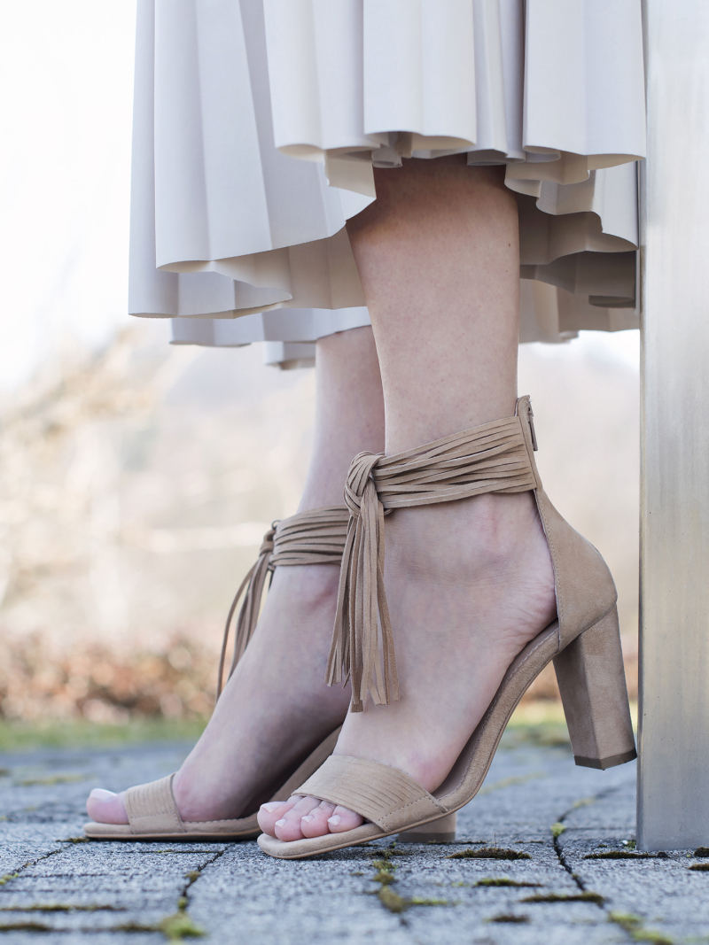 Wygodne buty damskie z skóry zamszowej z frędzlami na wygodnym słupku idealne do sukienki