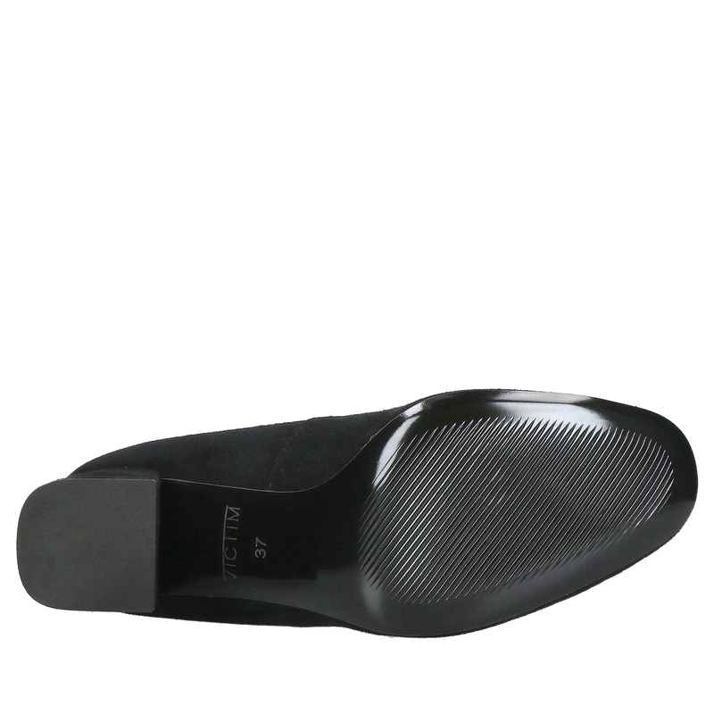 Damskie buty na szerokim obcasie ze skóry czarnej zamszowej, czółenka zamszowe na słupku ze złotą ozdobą