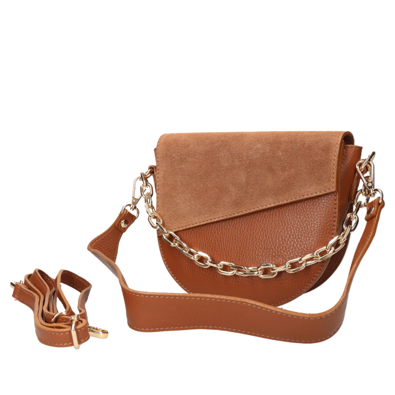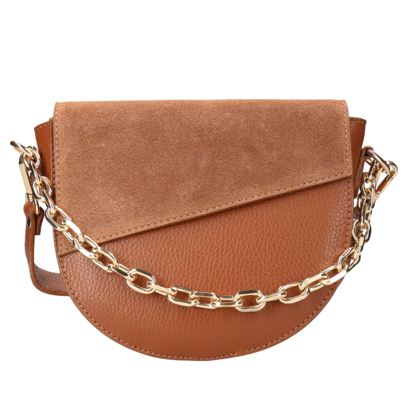 Brązowa torebka to idealna propozycja torebki dla kobiet ceniących dobry styl połączony z klasyczną formą oraz odważnymi dodatkami. Torebka ze złotym ozdobnym łańcuchem została wykonana ze skóry naturalnej licowej oraz zamszowej. Wnętrze posiada jedną komorę i jest wykończone podszewką. Posiada długi regulowany pasek oraz krótszy bez regulacji. Wewnątrz znajduje się mała, zasuwana kieszonka mieszcząca telefon czy klucze.