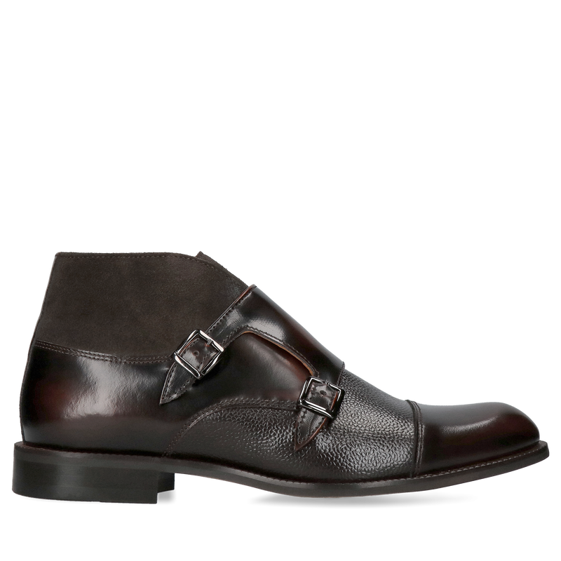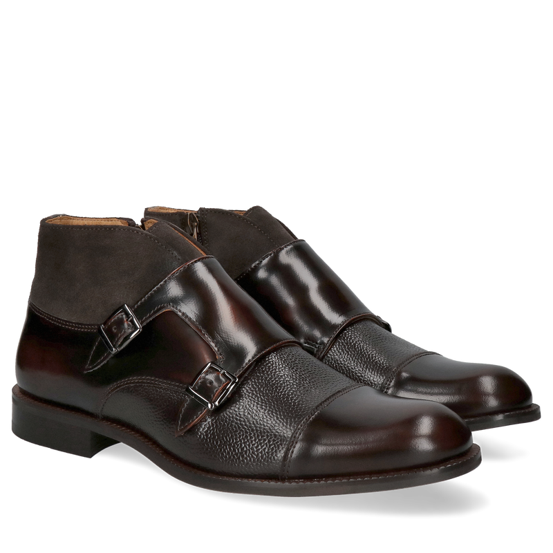 Trzewiki Tomy wyróżniają się klasycznym zapięciem w stylu MONK – dwie sprzączki w kolorze ciemnego niklu dodają całości nowoczesnego i eleganckiego wyglądu. Ten ponadczasowy detal sprawia, że buty idealnie komponują się zarówno z garniturem, jak i bardziej casualowymi stylizacjami, np. z ciemnymi dżinsami czy sztruksami. Perfekcyjnie wyprofilowana cholewka, dopracowane przeszycia i harmonijne połączenie trzech rodzajów skóry nadają butom wyjątkowego charakteru i prestiżu.